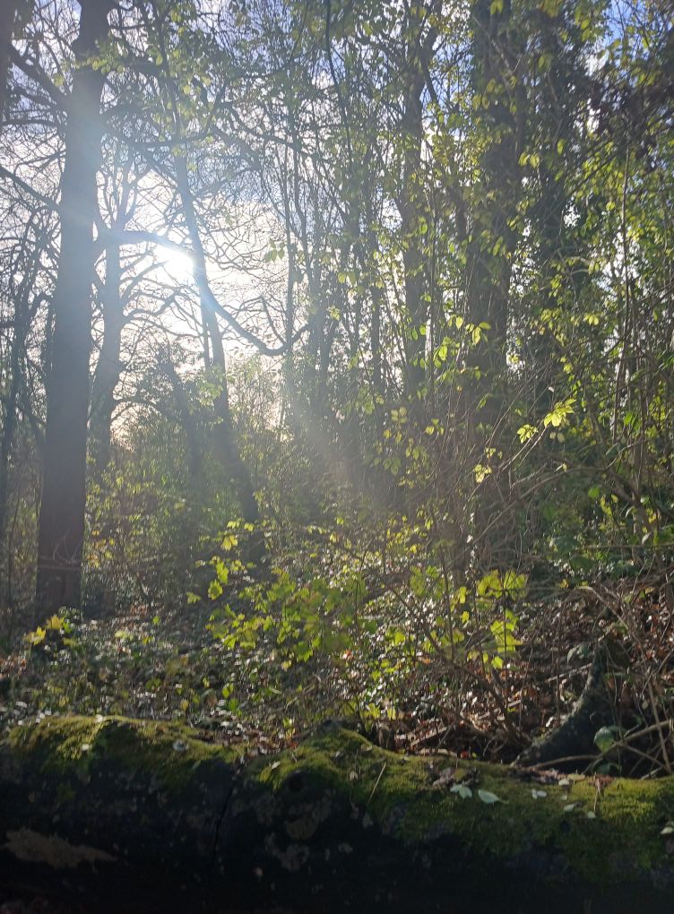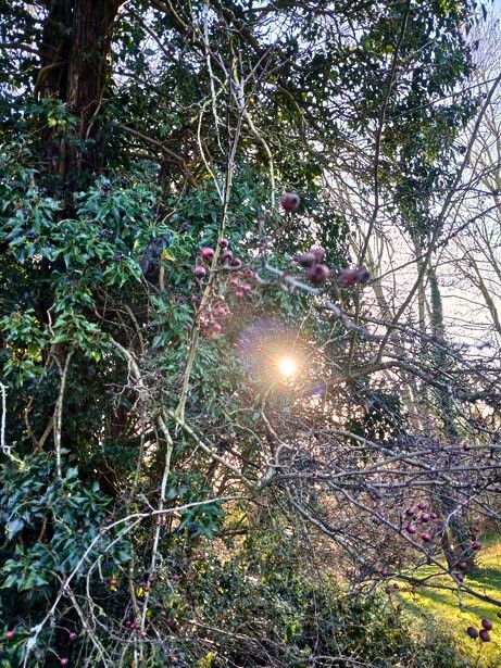 What do you notice when you see the sun? It might not be visible from here in summer, but the bare branches make the view much different and more visible than when all is richly covered in summer growth. The sudden view of the sun in winter offers a golden light and rich play of shadows. It is a feast for the senses, for colours of subtle shade and shadow against the brilliance of the sun.