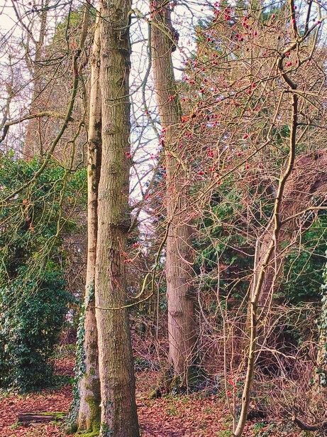 This is a quiet and contemplative walk. Nothing is rushed. Nothing is hurried. Along the way something may catch your eye. It could be an unexpected burst of festive colour, more redolant of the festive autumn than the hush of mid-winter. Or it could be the play of sunlight filtered through trees. You might notice the echoing of a solitary woodpecker, the sound amplified by the otherwise still woods. Or you might notice crows calling overhead, sitting one by one in a serious singlefile row on the skeleton branch of a tree, far above the woodland floor.